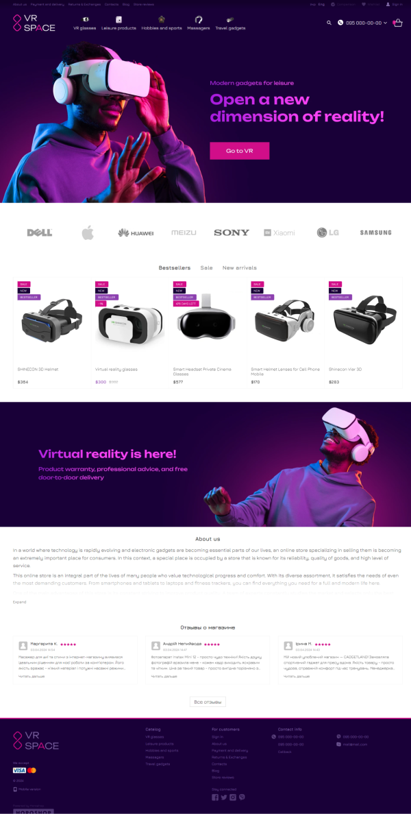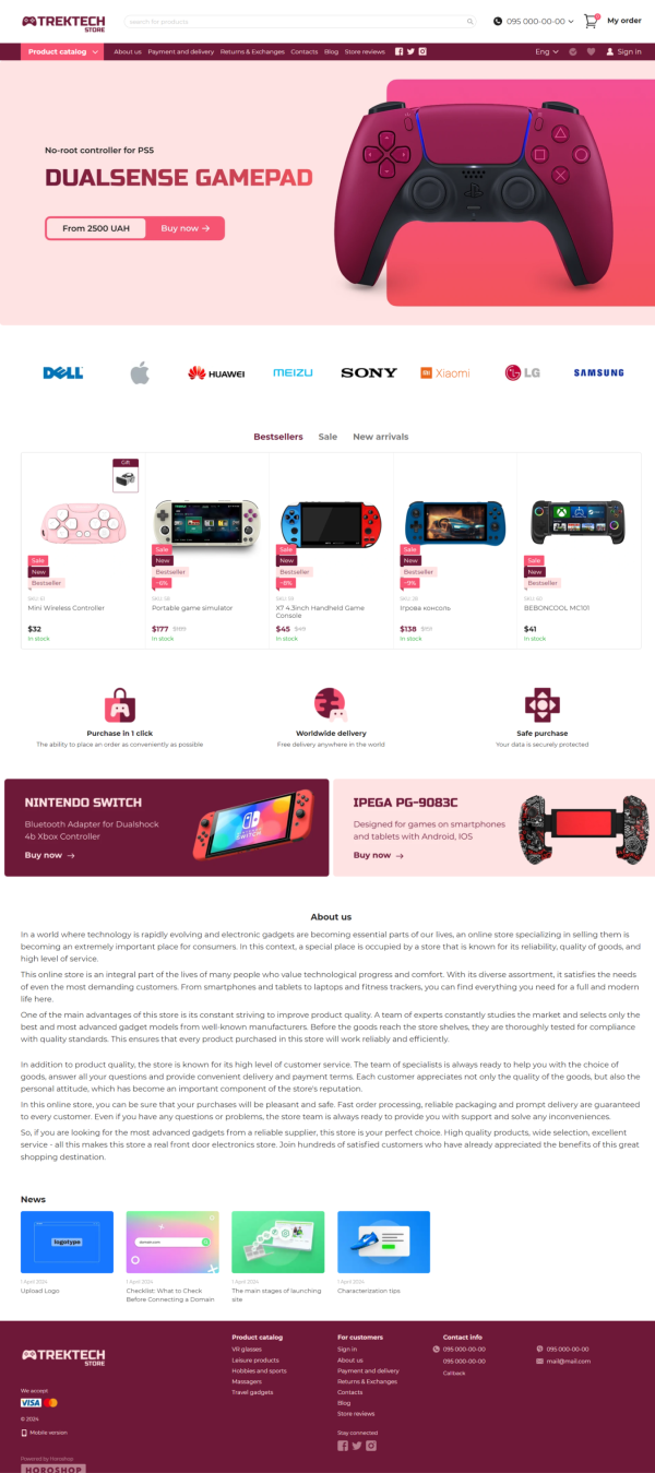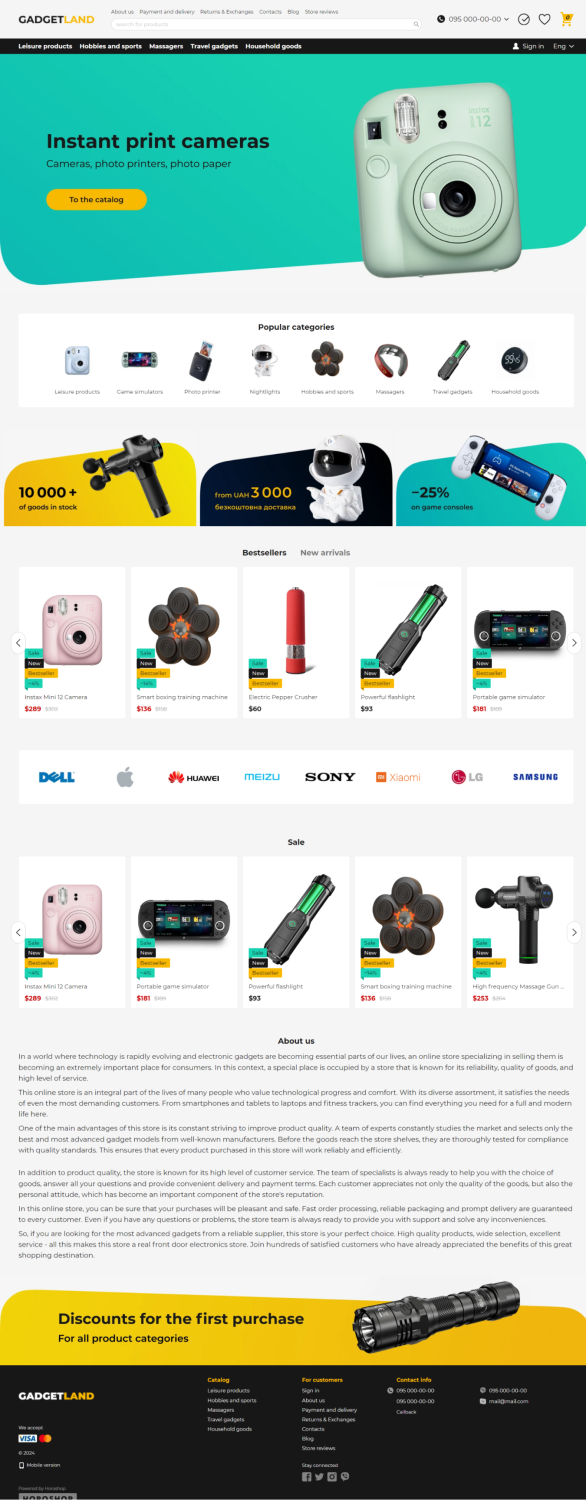 Magazinele online de electronice și gadgeturi pot folosi cu îndrăzneală culori strălucitoare și o mulțime de bannere. Este recomandabil să plasați un bloc pe pagina principală cu o listă cu mărcile pe care le oferiți, deoarece pentru mulți utilizatori producătorul dispozitivului electronic dorit este de importanță prioritară. Este mai bine să faceți cardurile să nu fie prea mari — de obicei, această nișă implică o mulțime de produse din sortiment, iar principalul lucru în ele sunt caracteristicile, nu fotografiile.