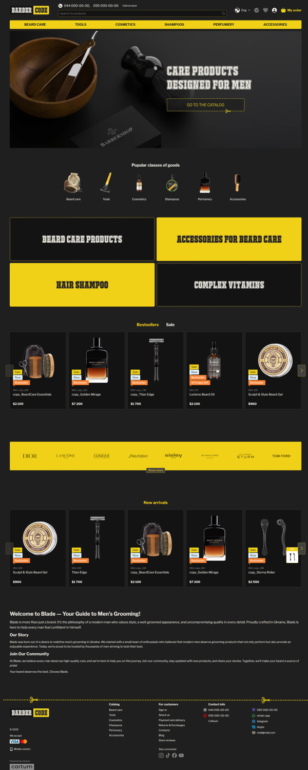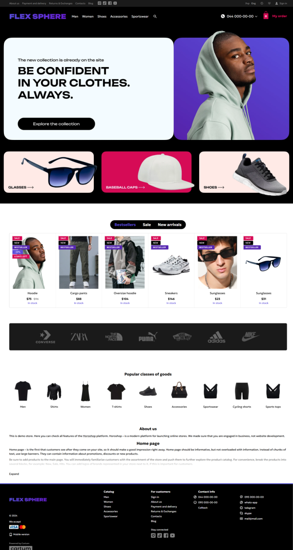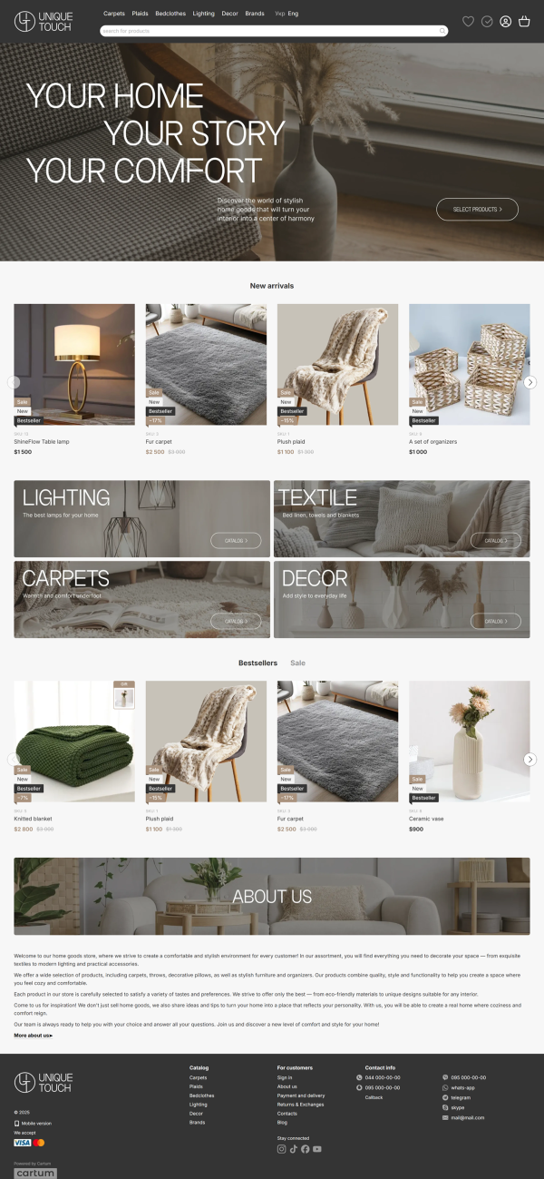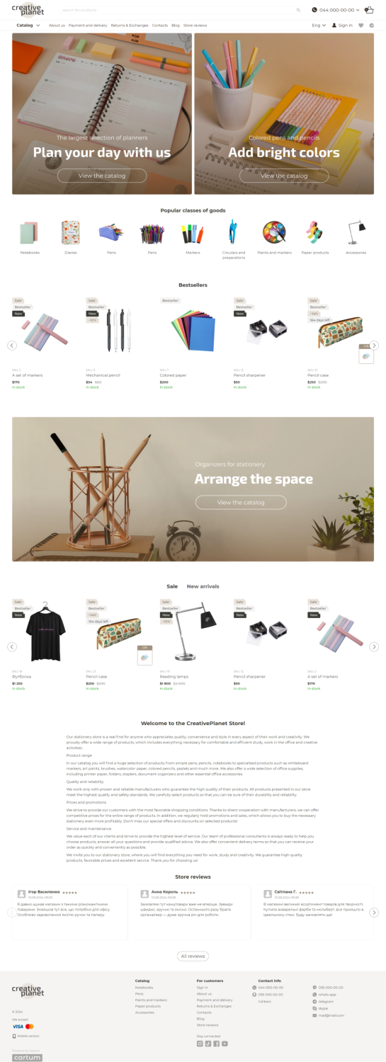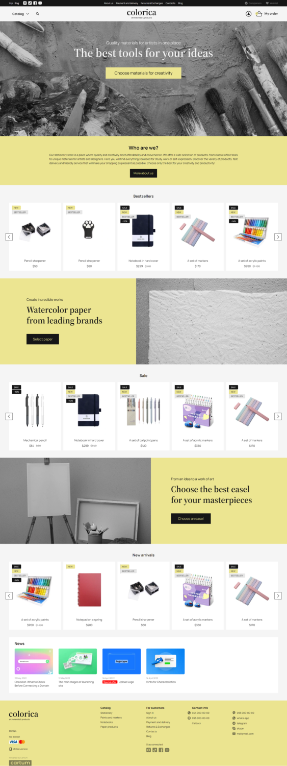 Peste 10.000 de magazine online au fost create pe baza design-urilor noastre. Unii clienți au ales una dintre machetele din galeria noastră de design și au făcut modificări minime, de exemplu, schimbând culorile antetului și butoanelor. Alții au personalizat designul vizual cât mai mult posibil în cadrul capabilităților platformei Cartum folosind editorul de design convenabil din panoul de administrare.