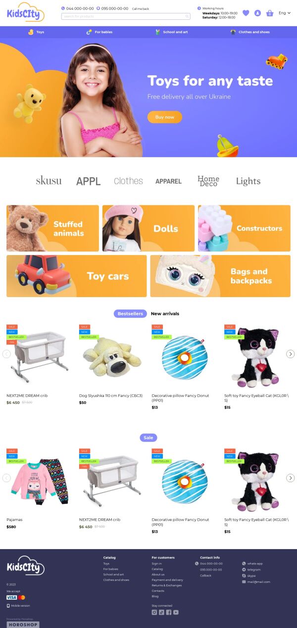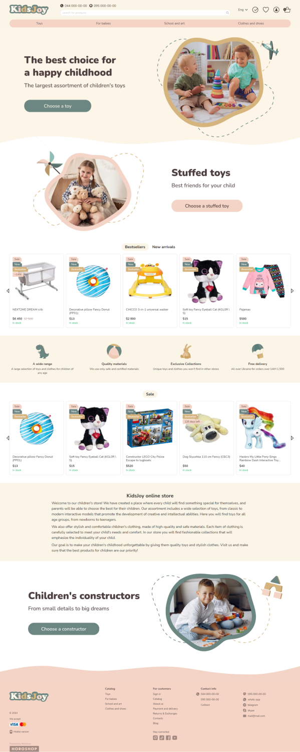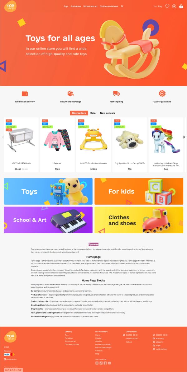 Când creați un magazin care vinde astfel de produse, este important să rețineți că clienții dvs. sunt părinți, nu copii. Prin urmare, modelele cu elemente desenate sau personaje populare de desene animate nu sunt foarte potrivite. Dar alegerea unor culori de accent strălucitoare pentru a sublinia tema copiilor ar fi o idee bună. Principalul lucru este că merg bine împreună.