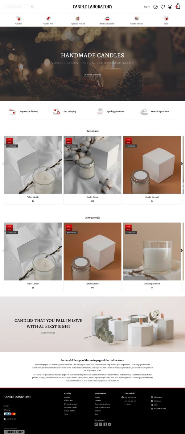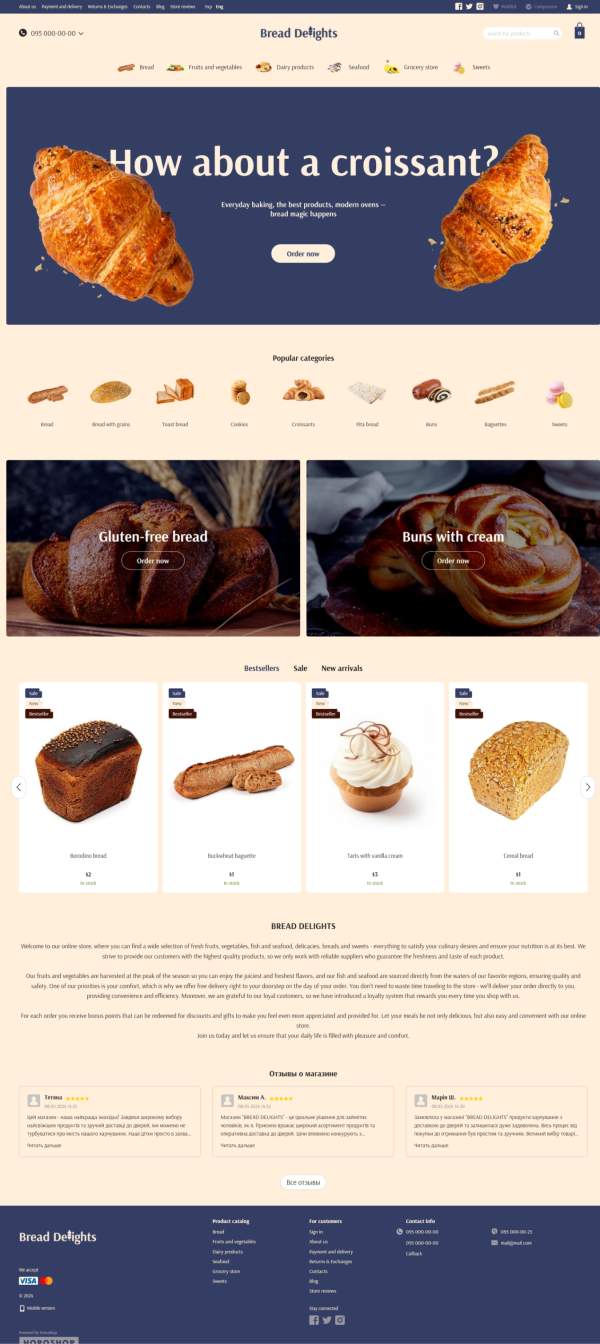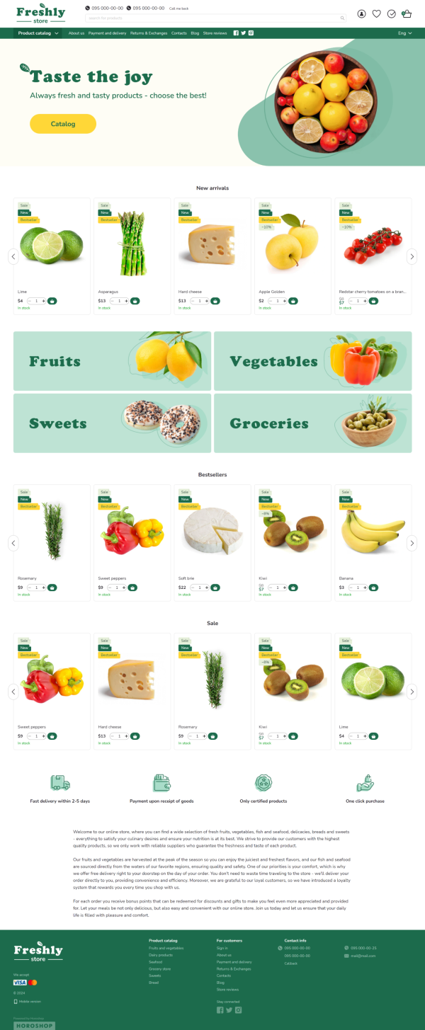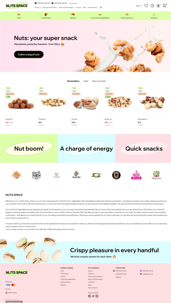 Designul unui magazin alimentar online depinde și direct de produsele pe care le oferiți. Schema de culori a site-ului dvs. poate fi radical diferită — de la tonuri calde de bej, atunci când vindeți produse de patiserie, până la o paletă suculentă „de vară”, dacă sortimentul include delicii sănătoase, cum ar fi fructele uscate, bezele și alte delicii.