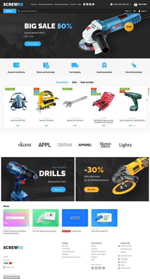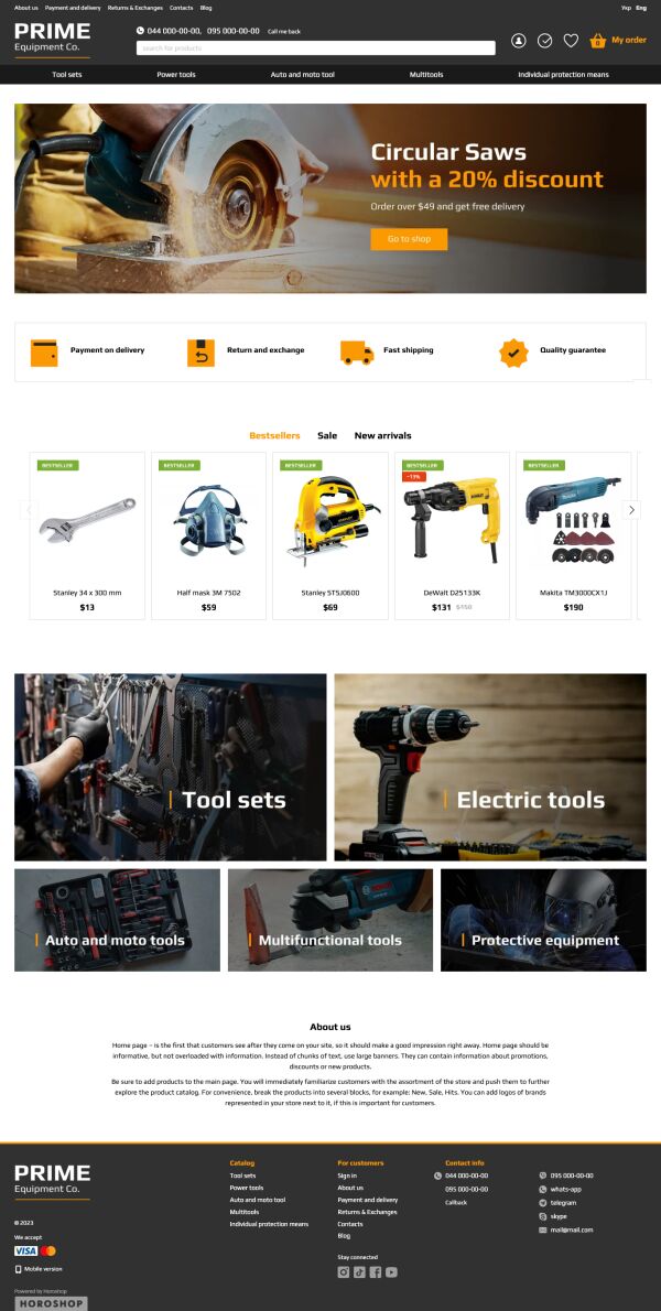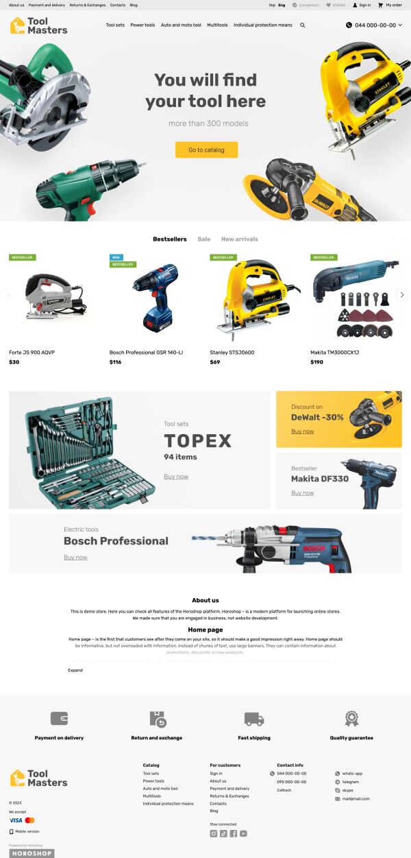 Publicul țintă al unui magazin online de scule electrice este în principal bărbați, iar designul său ar trebui să fie adecvat — reflectând durabilitatea, fiabilitatea și acuratețea. Pentru design vizual, alegeți o schemă de culori calmă. Nuanțele de albastru, verde, portocaliu pastel, precum și gri sau grafit ar fi o soluție excelentă. Puteți alege alte culori după bunul plac, dar evitați o paletă prea strălucitoare.
