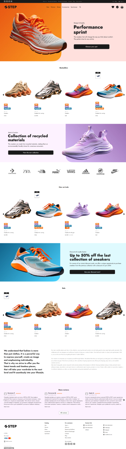 Principalele tendințe pentru designul unui magazin online de îmbrăcăminte și încălțăminte este mult spațiu, minimalismul și bannere elegante. Cele mai bune culori primare pentru interfață sunt alb-negru. Pentru a crea contrast, este recomandabil să adăugați o linie de banner strălucitoare pe pagina principală.